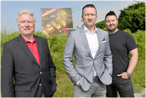 The Durham Live site in Pickering was chosen for a casino to open in 2019. Mayor Dave Ryan (left) with brothers Steve Apostolopoulos and Peter Apostolopoulos — the developers of the Durham Live site. (JASON LIEBREGTS / METROLAND FILE PHOTO)